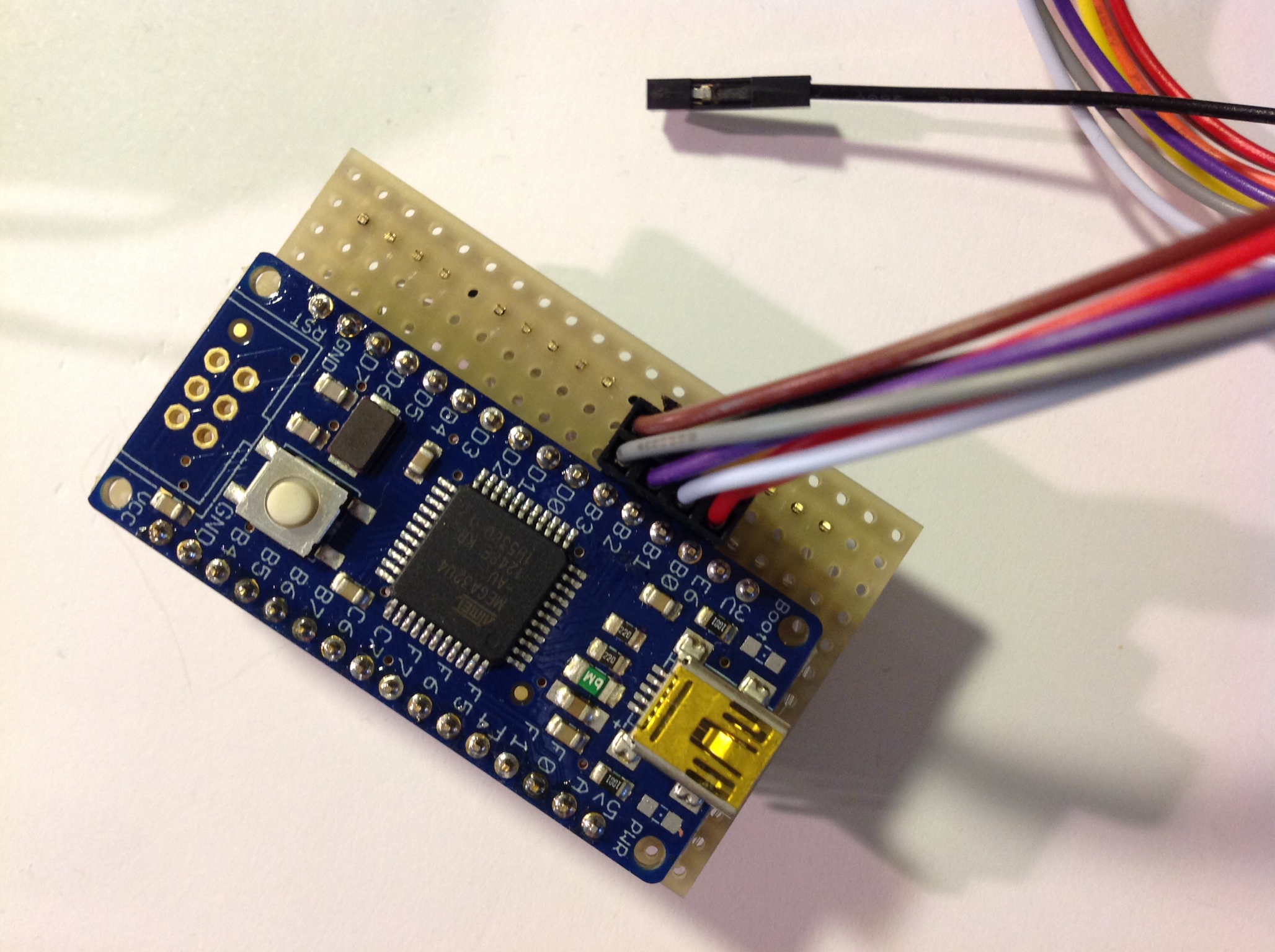 For the extended processing I used an Atmega32u4 breakout board from Adafruit, http://www.adafruit.com/product/296. (I removed the two LEDs from the board. First, because there’s no need to light up the inside of the meter. Second, and more importantly, I needed the PE6 pin as an interrupt and not as a communication monitor.)
