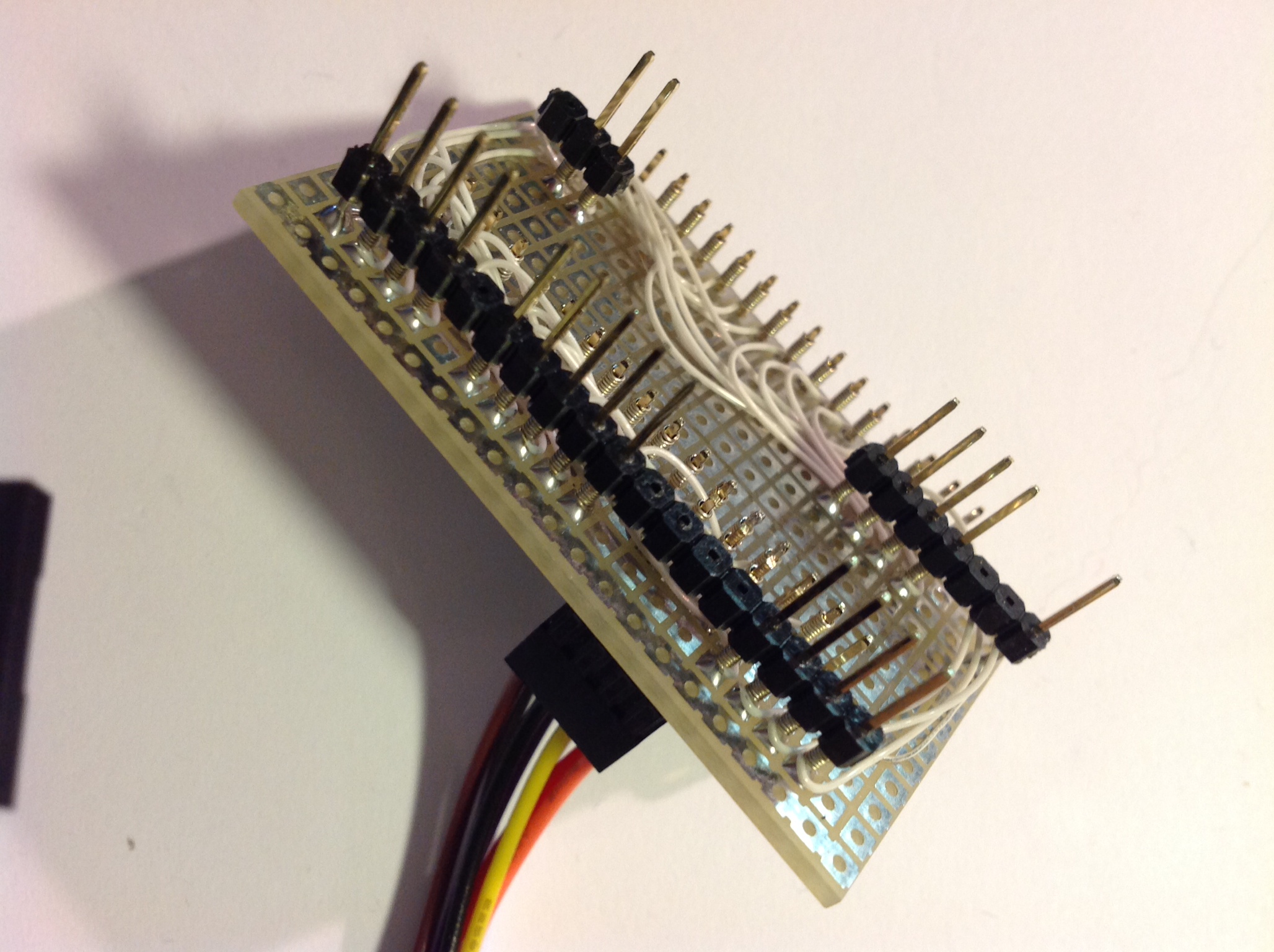 The breakout board is mounted to a bit of perf-board with pins to match the headers on the piggyback board. There’s an 8-pin connector to the display and the low battery sense. Yes, that is actually wire-wrap.