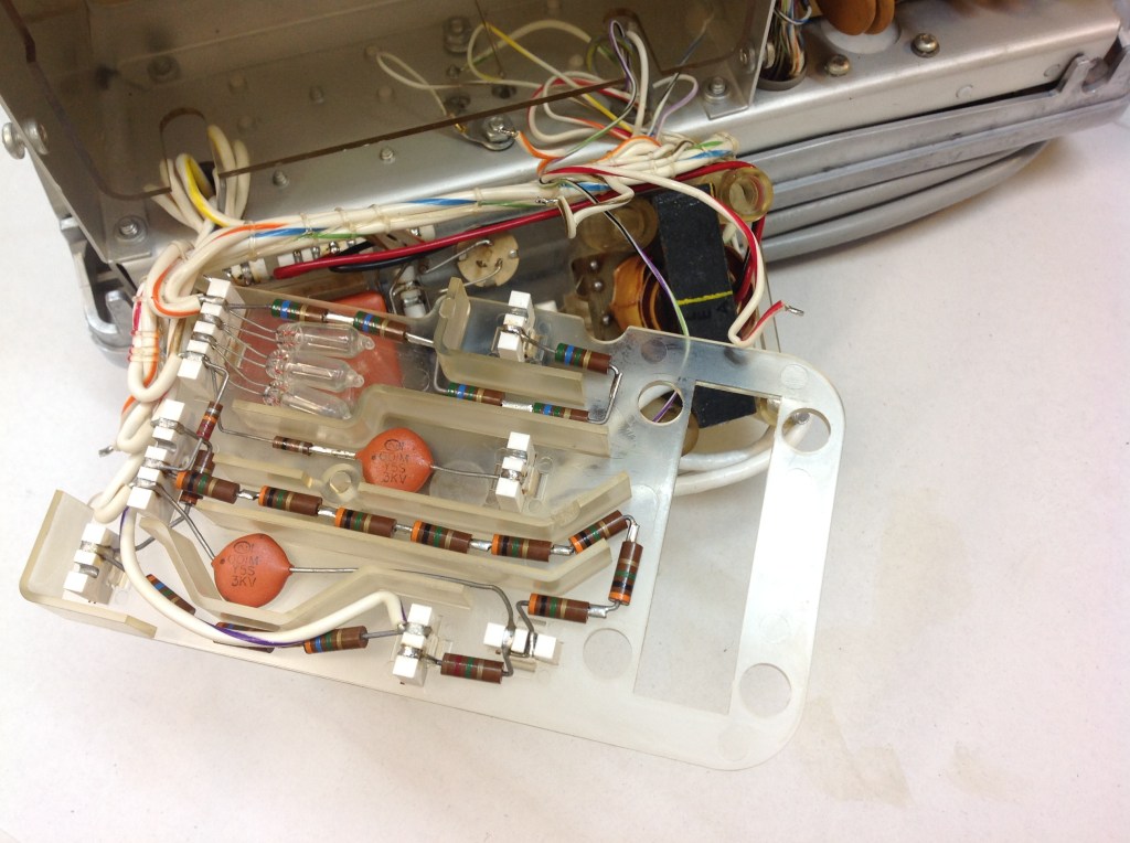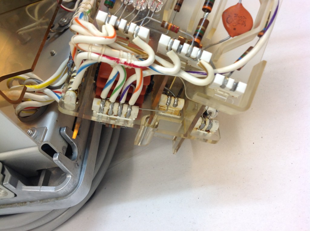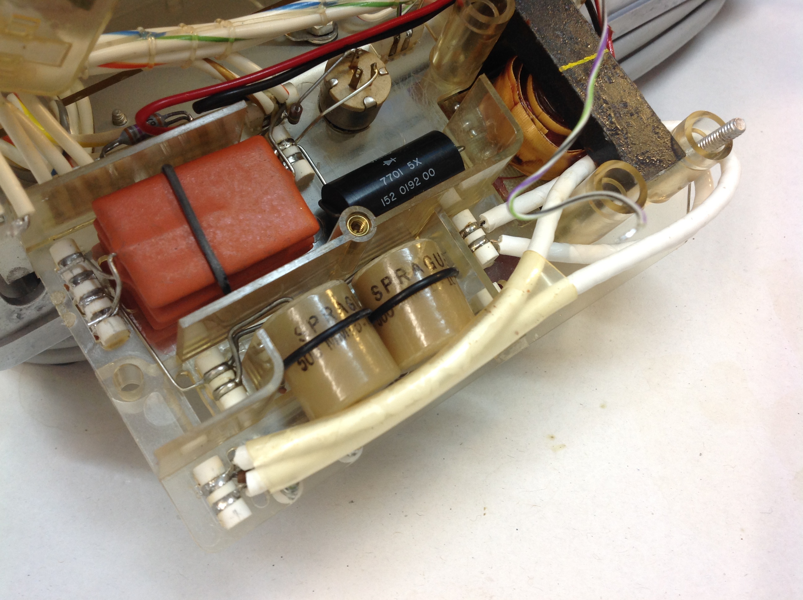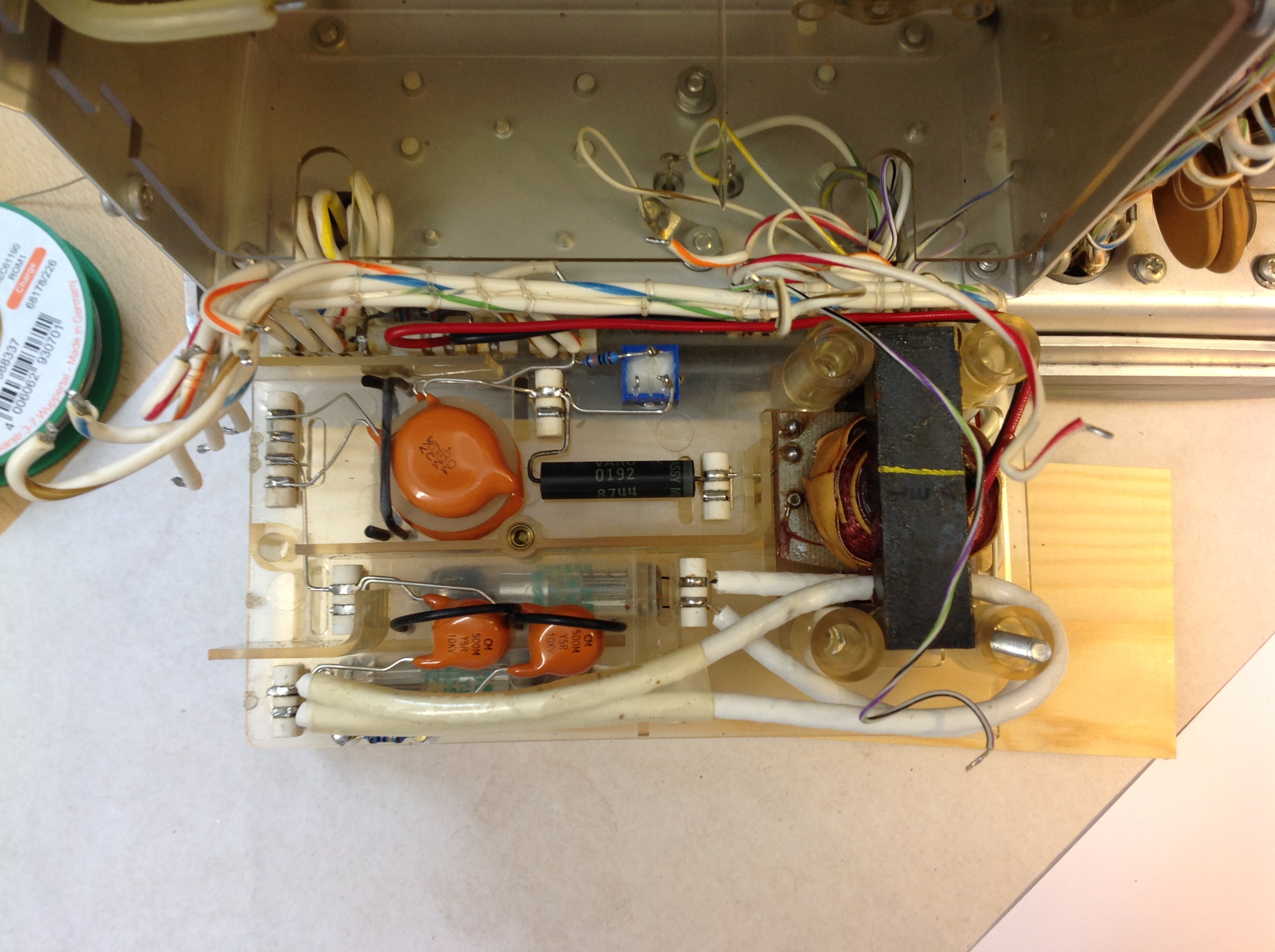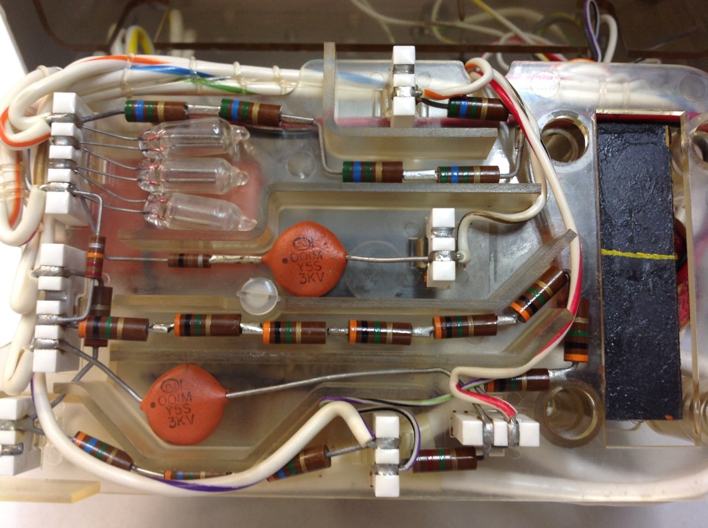 Here is the high voltage box with covers off, looking at the bottom (remember, the box is ‘upside down’ in the bottom of the ‘scope).