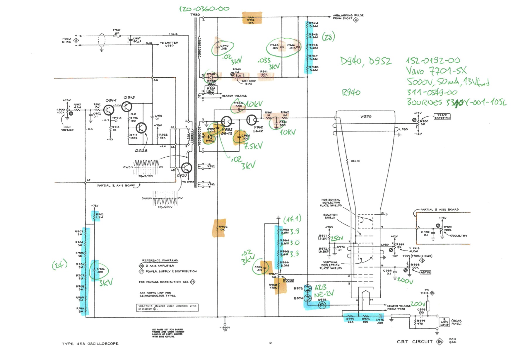 I’m really glad to have my 453 back in working condition. Aside from working again, the rebuild had additional payoffs. With everything new, the trace appears faster and settles down quickly. And it doesn’t grow dimmer for the first few minutes like before. Though not simple or easy, the rebuild went well. If you decide to do this, I suggest getting familiar with the circuits and to take your time. It took me a number of sessions working a couple of hours at a time. Document as you go! Don’t assume you’ll remember which wire went where or which wiring block slot this or that part was mounted to.