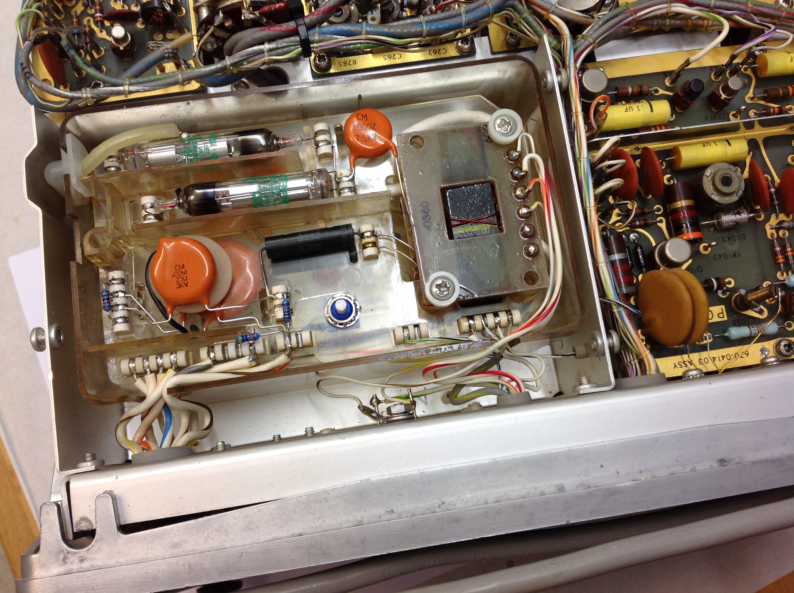 Recently, however, it developed a problem somewhere in the high voltage supply. When I turned it on, it made a sizzling sound and the display was compressed and very bright. I removed the cover over the high voltage box and saw that on power up, one of the 5642 rectifier tubes was internally arcing. (Thinking back, there was probably arcing elsewhere but I didn’t want to leave it on long enough to poke around!) ‘Aha, bad tube’, I thought. I found a couple of NOS Sylvania tubes on eBay and a few days later, the ‘scope seemed to be running fine again. Then, a couple of weeks later, the same sizzling sound. Again, a look at the high voltage box and there was arcing deep inside. On the suggestion of a couple of people on the Yahoo TekScopes group, I opened up the high voltage box and cleaned it out with IPA and put it back together. Again, the problem seemed to be fixed. But a few days later, it was back.